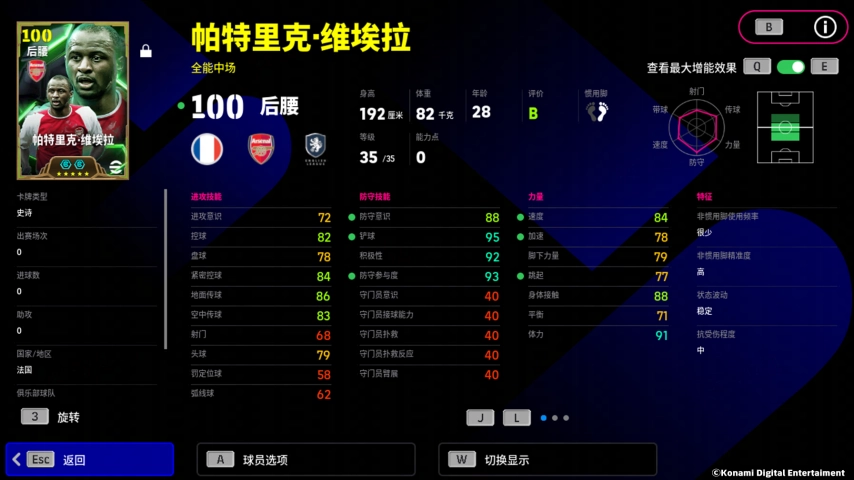【全能中场】风格的维埃拉不仅在防守端稳定发挥,更能凭借91分的体能覆盖全场,在进攻端有着不俗的表现!