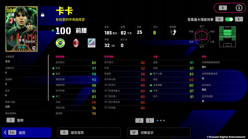 卡卡拥有【球场幻想家 +2】的增能属性,盘控数值的增强让卡卡的推进更加凌厉!