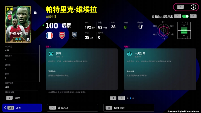 【防守 +2】的增能属性,让维埃拉的防守更上一层楼,用凶悍的铲断化解对手的进攻!维埃拉还自带特殊技能【无定型传球】,即使面对重重包围,他都能够用一脚妙传为队友输送炮弹!