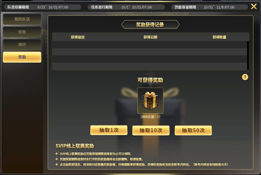 4.SVIP线上联赛奖励中,队长与队员的专属奖励箱会自动发放到[奖励页面],在页面保留期限结束前均可领取。消耗奖励箱即可进行抽取,按概率获取奖励。抽到的奖励将发放至账号内转送,该转送有效期为30天。(排名第1~3名队伍的队长奖励[道具转移券],会在排行统计结束后发放至账号内转送。)