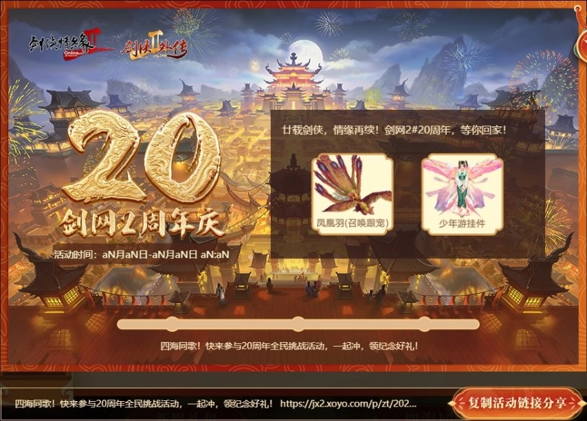 《剑网2》20周年之际推出全民挑战活动“四海同歌”,该活动包含新服预约、全民祝福、全服挑战三大挑战板块。待这三项挑战任务全部完成后,全区全服满足领奖要求的玩家,都能获得20周年纪念豪华大礼——凤凰羽跟宠与少年游挂件!