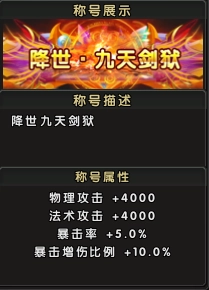 称号属性:物理攻击增加4000点,法术攻击增加4000点,暴击率提升5.0%,暴击增伤比例提高10.0%