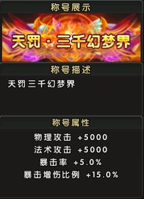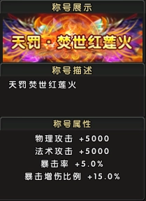 称号属性:物理攻击增加5000点,法术攻击增加5000点,暴击率提升5.0%,暴击增伤比例提高15.0%