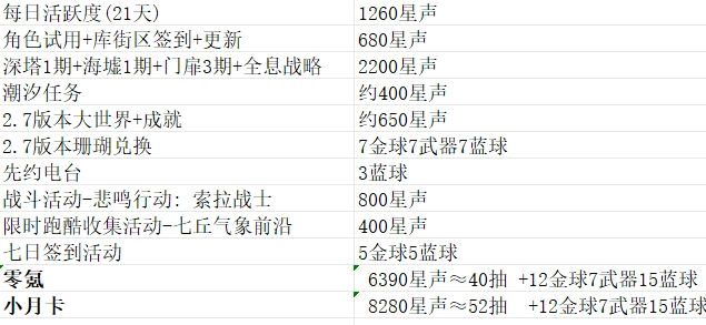 小月卡:8280星声约等于52次抽奖,还包含12个金球、7件武器和15个蓝球。