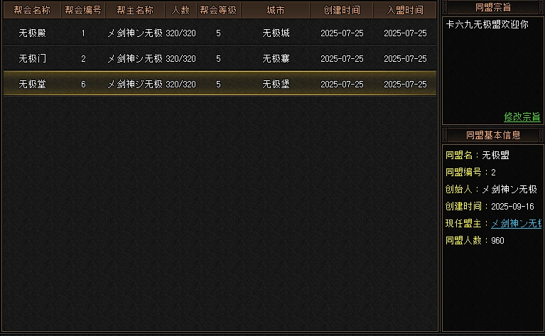 三个分帮,【无极殿】、【无极门】、【无极堂】,个个都是5级大帮,繁荣度惊人。他们的同盟宗旨就一句话:卡六九,无极盟欢迎你。