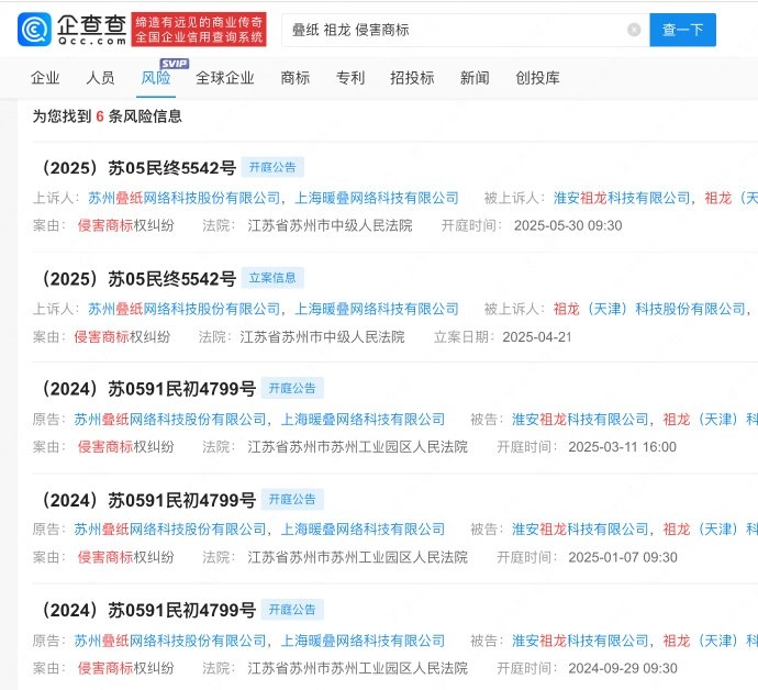 企查查APP最新信息显示,祖龙(天津)科技股份有限公司因涉及不正当竞争纠纷案件,已被江苏省苏州市苏州工业园区人民法院裁定强制执行,需向苏州叠纸网络科技有限公司支付15万元赔偿款。