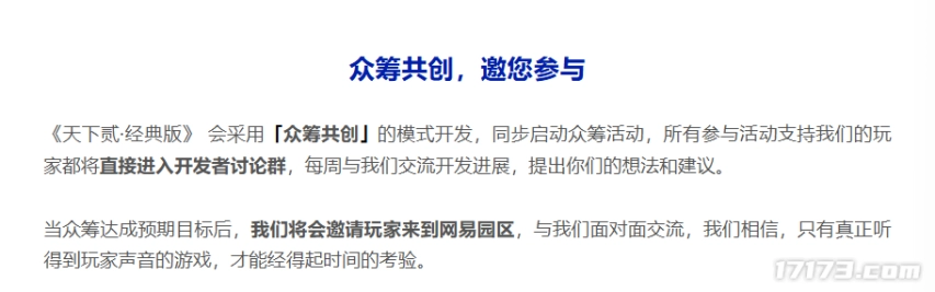 最让人意外的是,《天下贰·经典版》会采用「众筹共创」的模式开发,同步启动众筹活动。