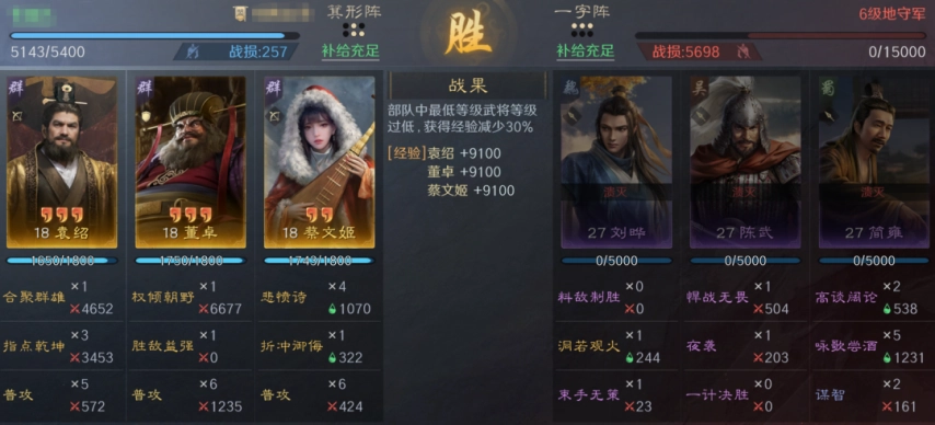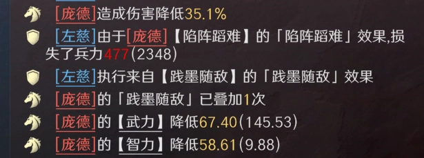 可以看到在践墨随敌的覆盖下之前难啃的守军(孙尚香、孙坚、庞德)都直接武智属性减到0了,输出大幅降低。