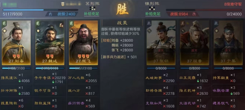 再顺便聊聊魏延开荒的当前情况,就目前而言魏延并不适合用来开荒。首先开服第一天是没有阵营战法的,这就使得他先天存在短板。其次是他造成伤害的速度太慢,而且流血效果只能由他一个人叠加,效率很低。这进而导致战斗中的兵力损失非常大,不是特别喜欢魏延的话不建议用他开荒。