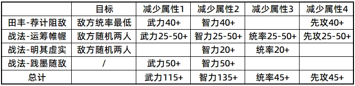可以看到田丰自带战法荐计阻敌与运筹帷幄搭配,大约能减少敌方97点属性,若叠加2层运筹帷幄的效果,则可达到132点属性的削减量。再配合明其虚实带来的35点属性降低,以及践墨随敌的70点属性削弱,足以将对手的属性压制至负值。