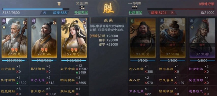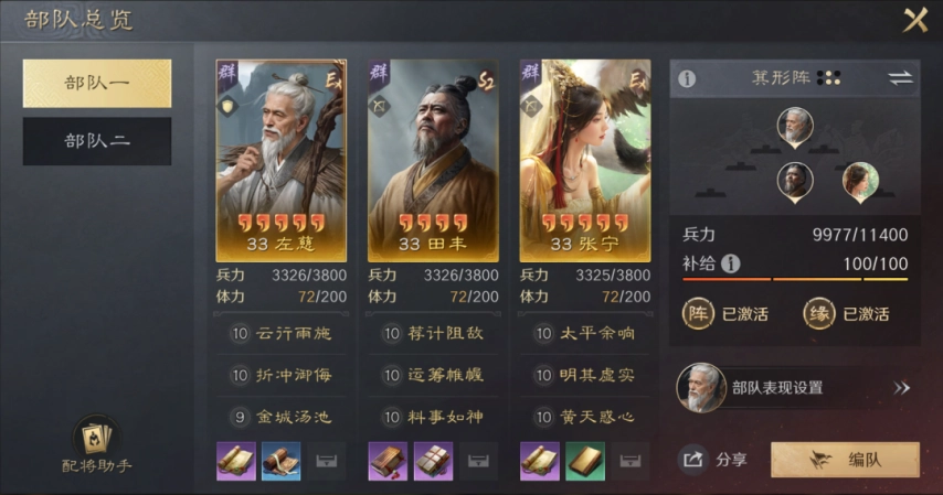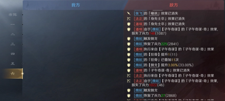 这里补充说明一个特殊情况:当左慈携带新战法“践墨随敌”时,根据测试,该搭配更适合全队红度达到10红左右的左田宁阵容。若红度低于这个水平,就可能出现舍本逐末的问题——队伍缺乏抵御保护机制,实战中很容易出现翻车风险。