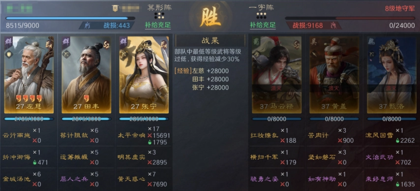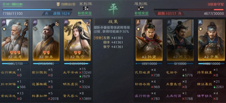 我也统计了下四减左田宁能覆盖的属性,虽说战法受发动率限制无法做到全覆盖,但整体而言能让低等级守军全程减少一百多属性,不管是输出还是生存压力都大大降低了。