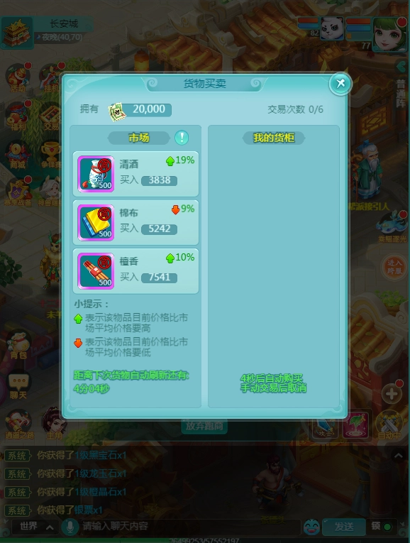 任务启动后,你可以先前往长安城的特产货商处采购货物,尽量把两万元银票全部用掉,接着将货物运到其他地图的特产货商那里出售;之后在这个货商处继续进货,再前往下一个地图售卖。