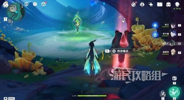 站在石头上朝东北方向眺望,就能看到蕴光月幻蝶所在区域的洞口。你可以直接从这里飞过去,也可以往右边走,先开启蓝珀湖的传送锚点,再前往目的地。