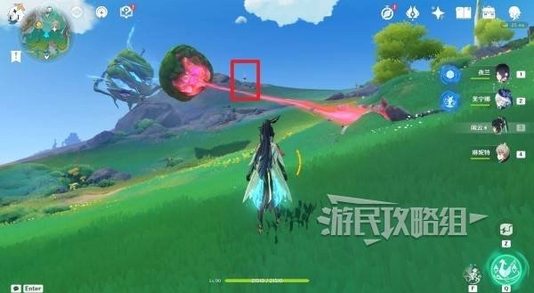 从伦波岛七天神像的位置出发,朝着右上角草地处的传送锚点行进。