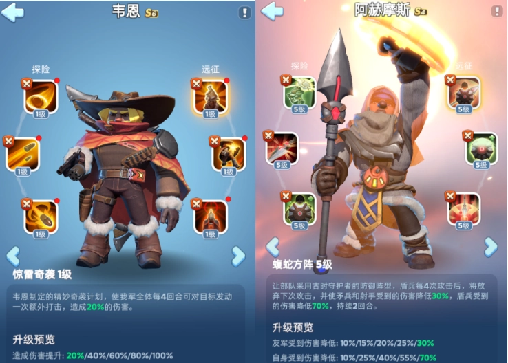 不过随着游戏版本的持续更新,新英雄的推出速度越来越快。特别是四代英雄之后,不少英雄都具备了专属伤害机制。例如6代射手韦恩,他的首个远征技能“惊雷奇袭”,效果是每四个回合就能对目标发起一次额外攻击,造成最高100%的伤害。而四代盾阿赫摩斯的第一个远征技能“蝮蛇方阵”,其效果为盾兵每进行4次攻击后,会放弃下一次攻击,同时让矛兵和射手受到的伤害最高降低30%,盾兵自身受到的伤害最高降低70%,该效果持续2个回合。