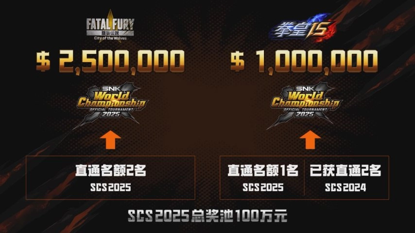 本届SCS 2025的比赛项目设定为《拳皇15》与《饿狼传说:群狼之城》,赛事总奖金池达到了100万元的高额标准。从5月赛事正式启动开始,便吸引了来自全球不同地区的格斗选手参与其中,赛事的影响力也在不断提升。