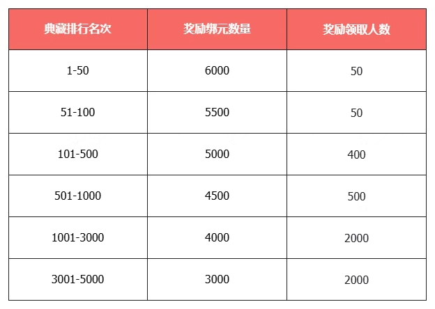 活动结束后,会依据所有玩家的典藏积分来排定名次。名次处于前30%(且最多不超出5000名)的玩家,将一起分享总价值1882万的大额绑元奖池!