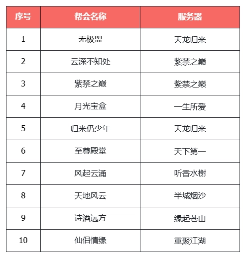 恭喜以上每个帮会获得1000绑元*30份奖励,祝贺各位帮主个人获得12000绑元奖励!