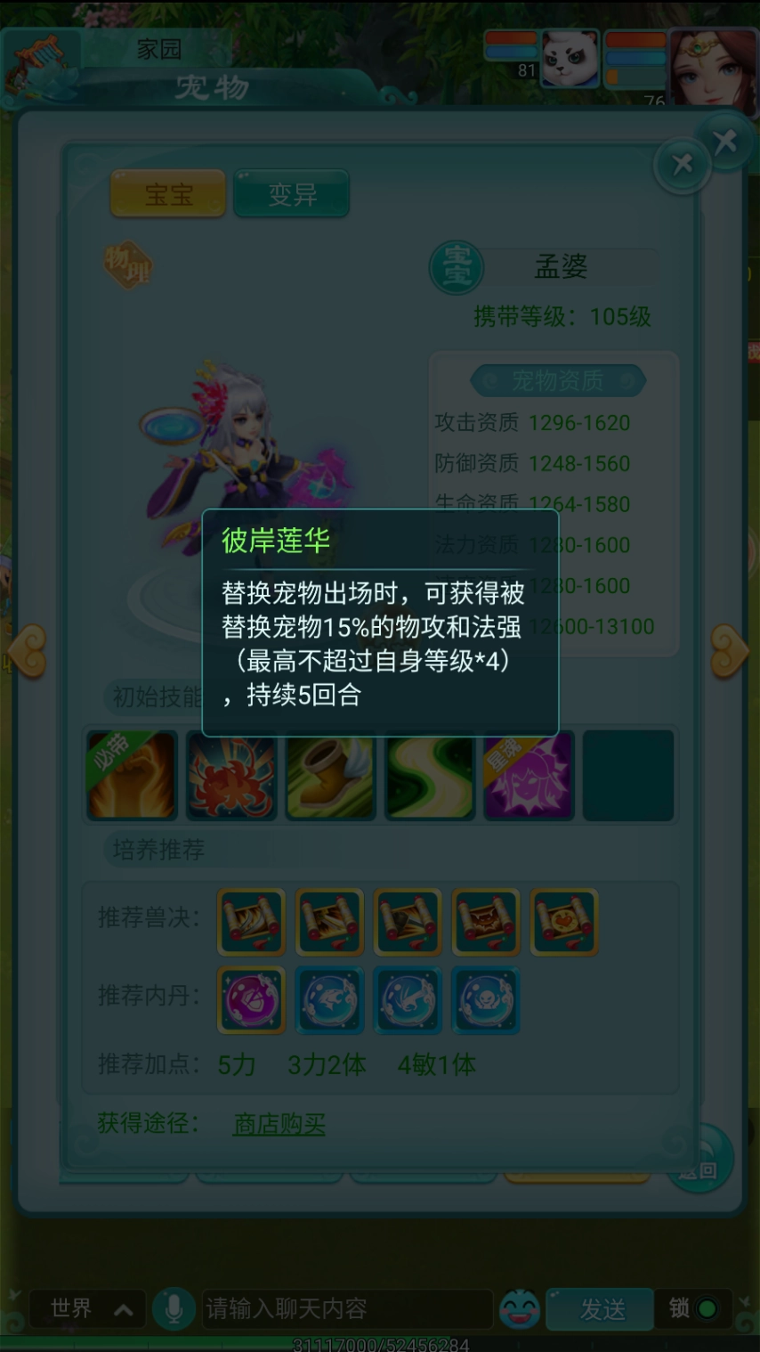 要是你计划专门培育这类频繁轮换出场的爆发型宠物,也能考虑搭配特殊技能“彼岸莲华”。这个技能可以让刚替换上场的宠物继承被换下宠物15%的物攻或者法强,再结合“气势”或者“充能”,一出场就能形成压制局面,很容易打乱对手的节奏。