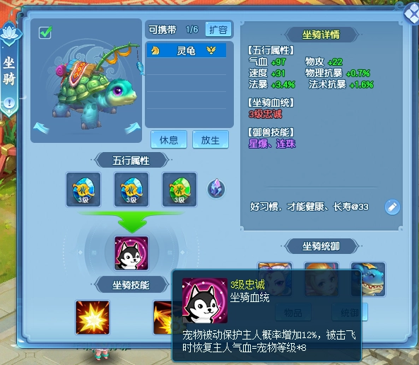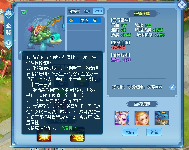 两个同属性的女娲石,再搭配一个相生属性的女娲石,就能让坐骑解锁一个血统技能。例如水生木,要是用“水木水”的女娲石组合,坐骑就能掌握血统技能“忠诚”,以此增强宠物对主人的守护效果。