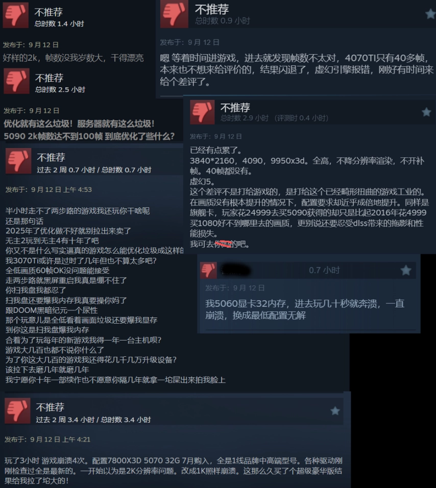 玩家们在差评里提到,这款游戏的优化问题相当严重——即便是4090显卡,运行时帧率都达不到40帧;5070显卡更是频繁遭遇游戏崩溃;就算是最顶级的RTX 5090,也只能跑出100帧左右的成绩。还有玩家忍不住吐槽:难道花298元买了游戏,还得再掏几万块去换最新款的显卡才能好好玩吗?
