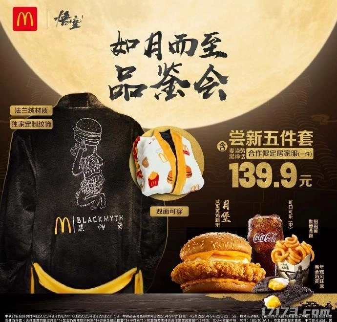 更让粉丝们感到惊喜的是,购买这款套餐的顾客还能额外获得一件《黑神话:悟空》与麦当劳联名推出的限定款双面可穿法兰绒家居服。这件家居服选用了高品质的法兰绒面料,上面印有独家定制的纹饰图案,其设计灵感来源于游戏里“天命人”的战袍元素,不仅实用舒适,还具有很高的收藏意义,因此被网友们风趣地称作“黑神话战袍”。