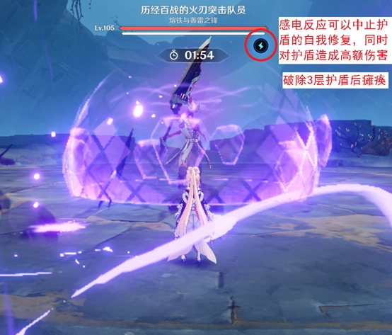 火刀队员入场后会立即开启三层防护罩,每层防护罩的血量上限为自身血量的4.5%(大约41万)。该防护罩除了雷元素抗性为0外,其他元素抗性均达到70%,并且会以较快速度进行自我修复。当使用感电或月感电攻击防护罩时,能够终止其自我修复效果。此外,感电反应对防护罩的伤害加成提升600%,月感电反应的伤害加成提升200%。在防护罩被破除后,火刀队员的雷元素抗性会降至-100%,其他元素抗性则降至-40%。