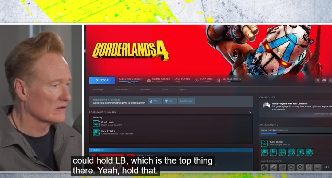 喜剧演员与脱口秀主持人柯南·奥布莱恩,近日于自己的节目里试玩了即将推出的《无主之地4》,还凭借其一贯夸张又幽默的风格,呈现了一段颇具话题度的实机演示内容。