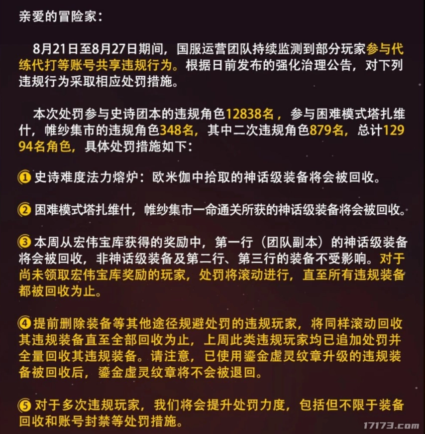 8月4日,针对代练、代打等破坏游戏环境公平性的行为,《魔兽世界》国服运营商网易雷火发起了“反不良代练”的倡议,明确将在正式服11.2版本更新后,重点对大秘境、M团本及PVP领域的代练现象进行集中治理,严厉打击从事代练服务的工作室。