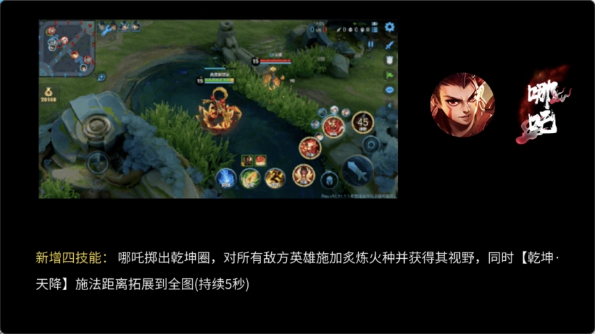 此次哪吒调整的另一项重点内容,是为其新增了四技能【乾坤圈】,该技能具备全图视野查看功能,这一效果与老版本哪吒大招自带的全图视野特性一致,并且乾坤圈的伤害会受到被动火种层数的影响;此外,在四技能的加持作用下,哪吒的三技能能够实现全图范围内对任意目标的飞行突进。
