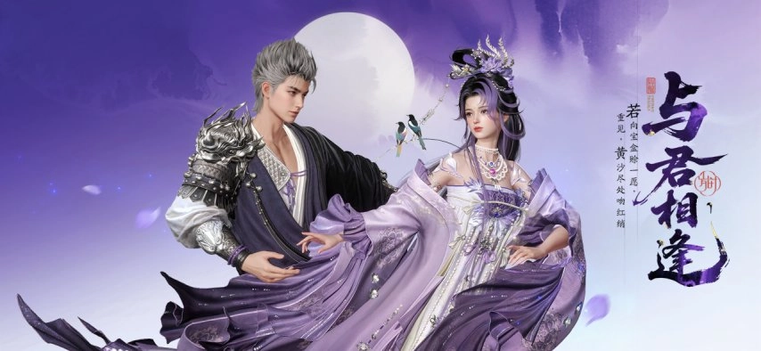 【与君相逢·普通礼盒】内含【双人动作·缘定三生】、【时装·与君相逢】、【发型·青空紫霞】、【头饰·银汉长空·男】或【耳饰·青空紫霞·女】、【腰饰·定情木匣】、【背饰·心心相印】以及【背饰·宵月鹊桥】。