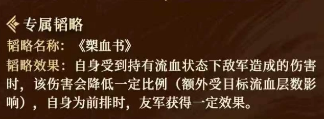 当自身受到处于流血状态的敌军攻击时,所受伤害降低5.0%(该效果会随目标身上的流血层数额外提升);若自身位于前排位置,友军将获得此效果50%的加成。