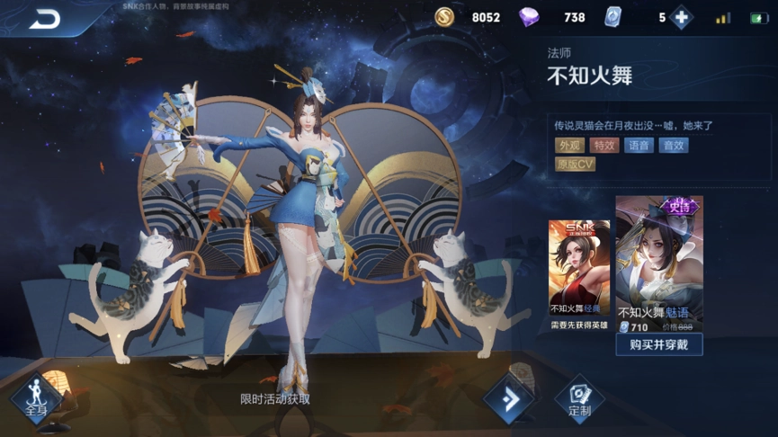 下面来聊聊不知火舞的新皮肤,这款皮肤名为魅语,整体呈现出浓郁的日系风格,这与不知火舞本身的日系英雄设定相契合。出场动画里,首先看到的是一艘日系风格的船,灵猫牵引着船划过天空,画面十分唯美。紧接着,躺在船上的不知火舞便映入眼帘。该皮肤以蓝色为主色调,尽管是裙装设计,却带有明显的日系和服韵味。发型和原皮肤差异不大,但多了一个猫形面具,显得颇为有趣。魅语的扇子边缘也带有猫状花纹,扇子始终散发着蓝色的寒光,看起来极具威慑力。