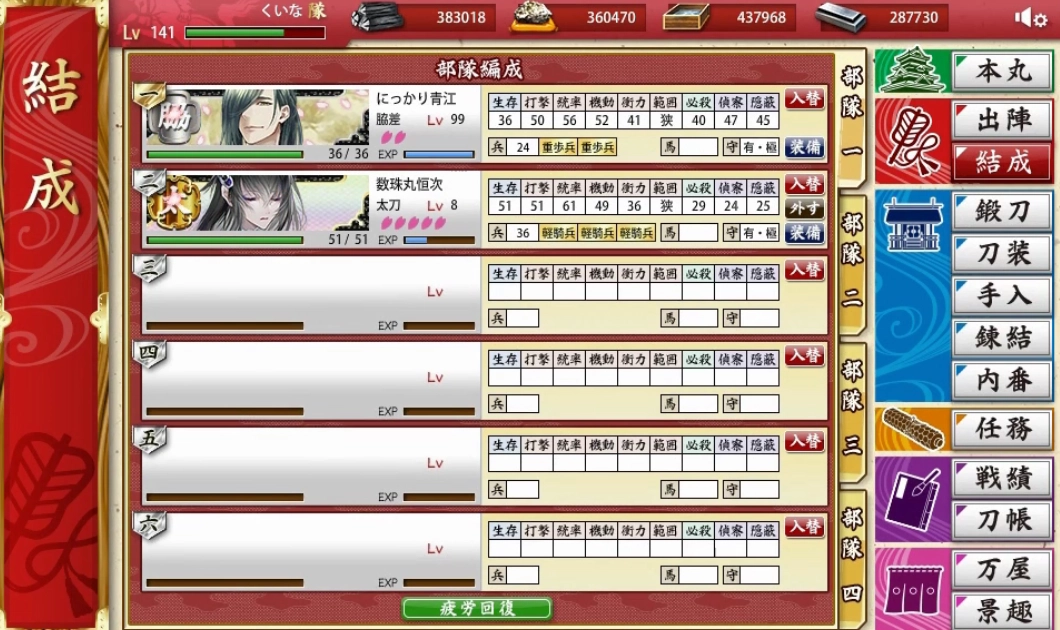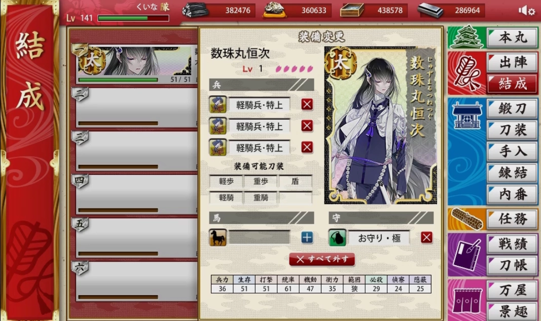 玩家获得数珠丸恒次后,首要任务是提升它的等级。等级较低时数珠丸可以编入高等级队伍中获取经验,要是玩家在参与活动,也能将数珠丸放在队伍末尾一同参与活动来升级。
