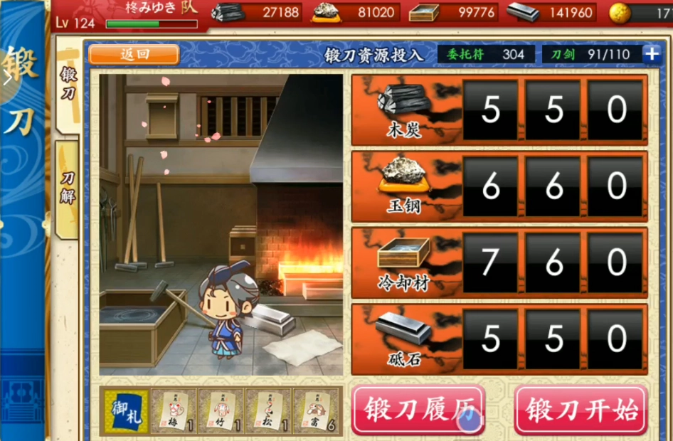 数珠丸可在游戏里通过普通锻刀获取,锻造公式建议采用四种资源各950,再加上一个富士绘马。它的锻造时间是刀剑乱舞游戏里最长的,得花十个小时来锻造。