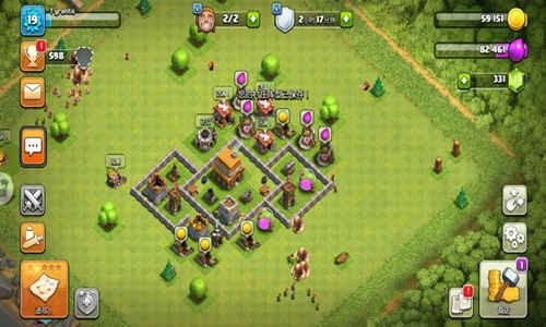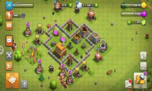 大本放在城墙里面,中央配备了迫击炮,其实在低本阶段迫击炮是比较关键的防御。这个阵型要是用胖子从两个加农炮的位置进攻,会被弹簧弹走一部分兵力,再去造箭塔的话兵力就不够了。如果直接攻击箭塔,在破坏城墙这一步会浪费大量时间,估计也会被迫击炮打得差不多了。不过这个阵曾被全弓箭部队平推过。