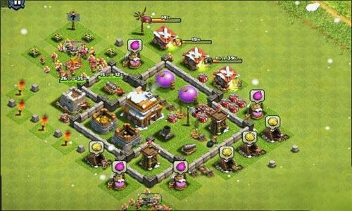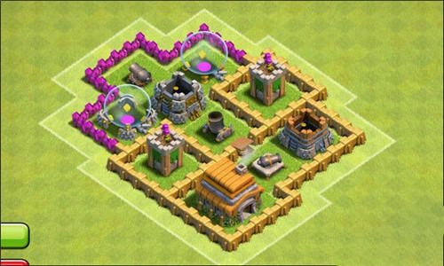 这个阵型虽然把资源都集中布置在围墙里,但不管从哪个方向动手抢资源都不太容易。另外教大家一个小技巧:要是你在升级大本营时资源暴库担心被抢,就去买些装饰,等大本升完再把装饰卖掉。这样虽然会损失50%的资源,但总比被别人抢走要好。