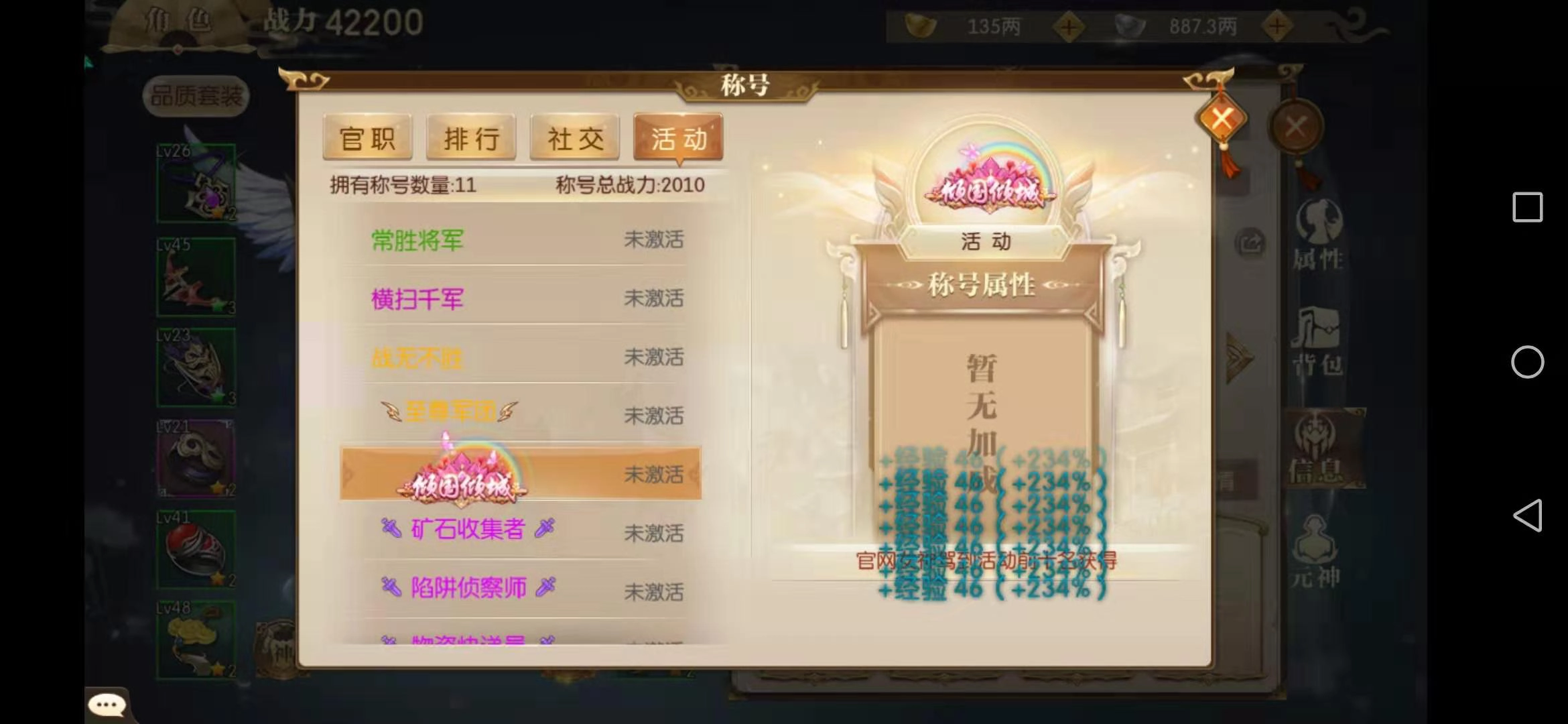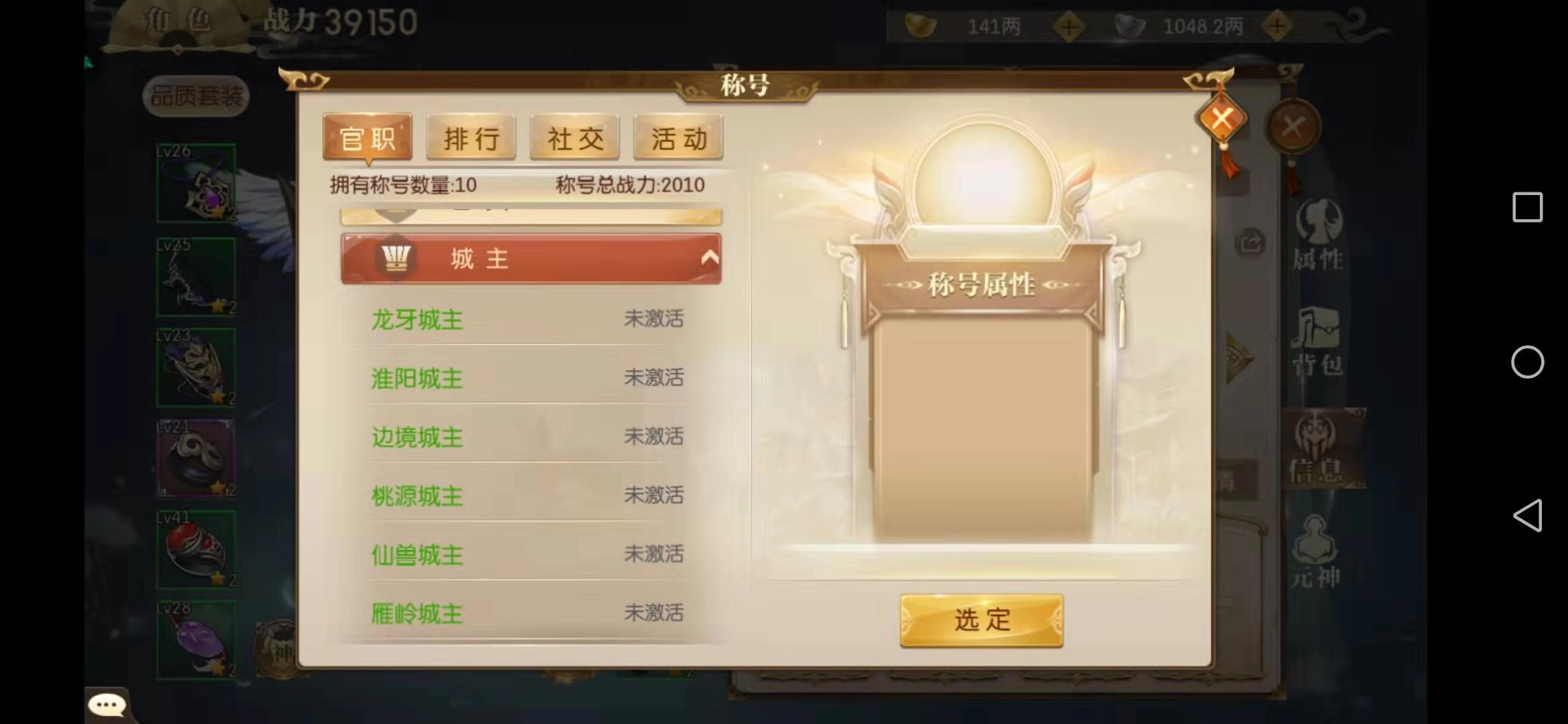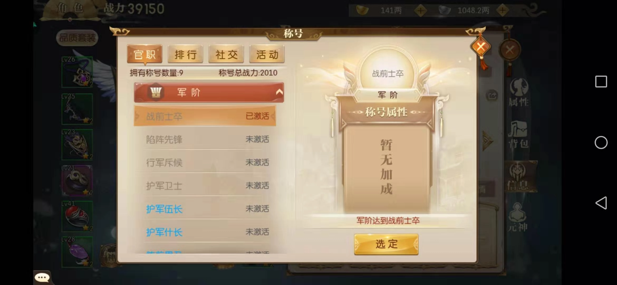 官职类称号涵盖军阶、官员与城主三个类别,这当中军阶是普通玩家接触最多的。它从最低级的战前士卒一直到最高级的大将军,总共有24个等级,军阶等级划分十分严格。获取军阶的途径并不复杂,玩家只需积累足够满足晋升要求的功勋,就能提升到更高等级的军阶。