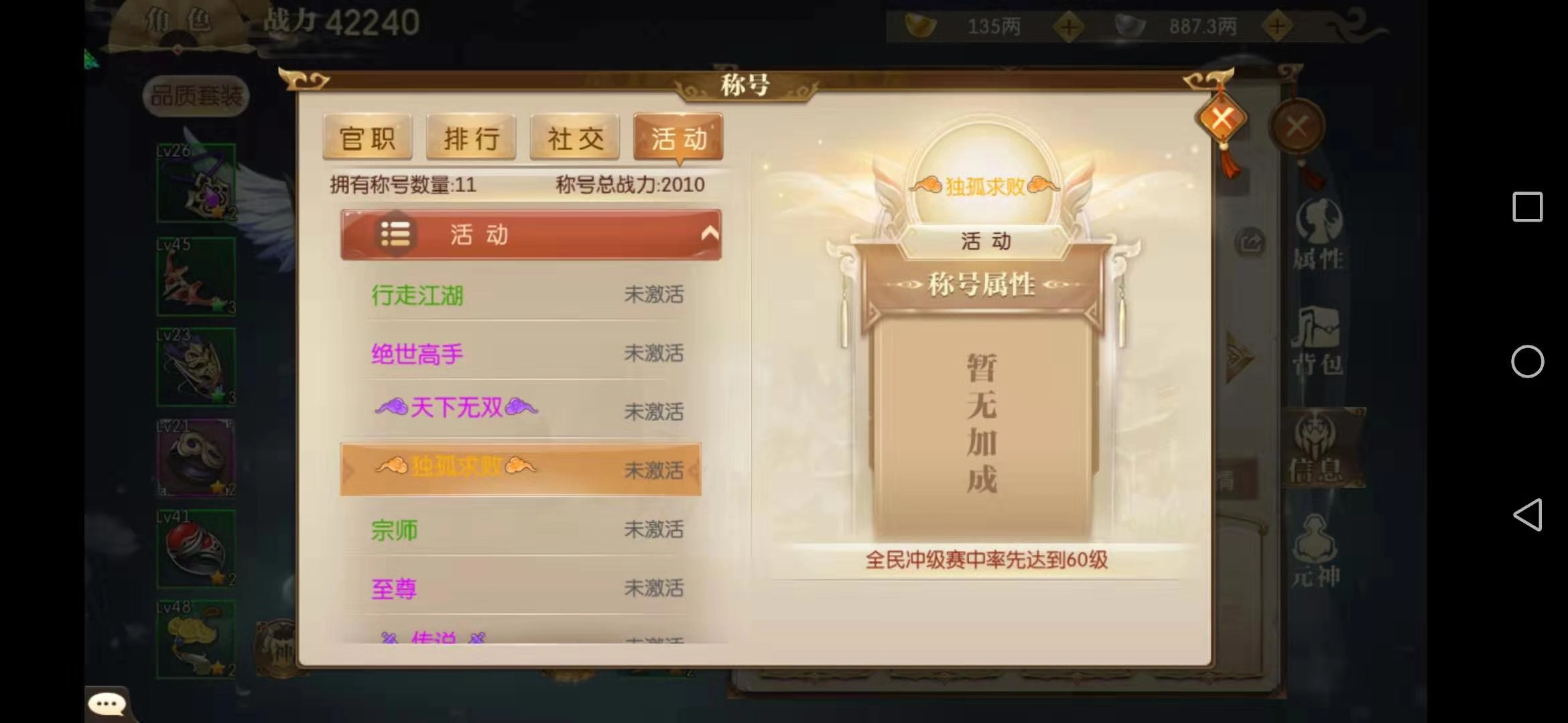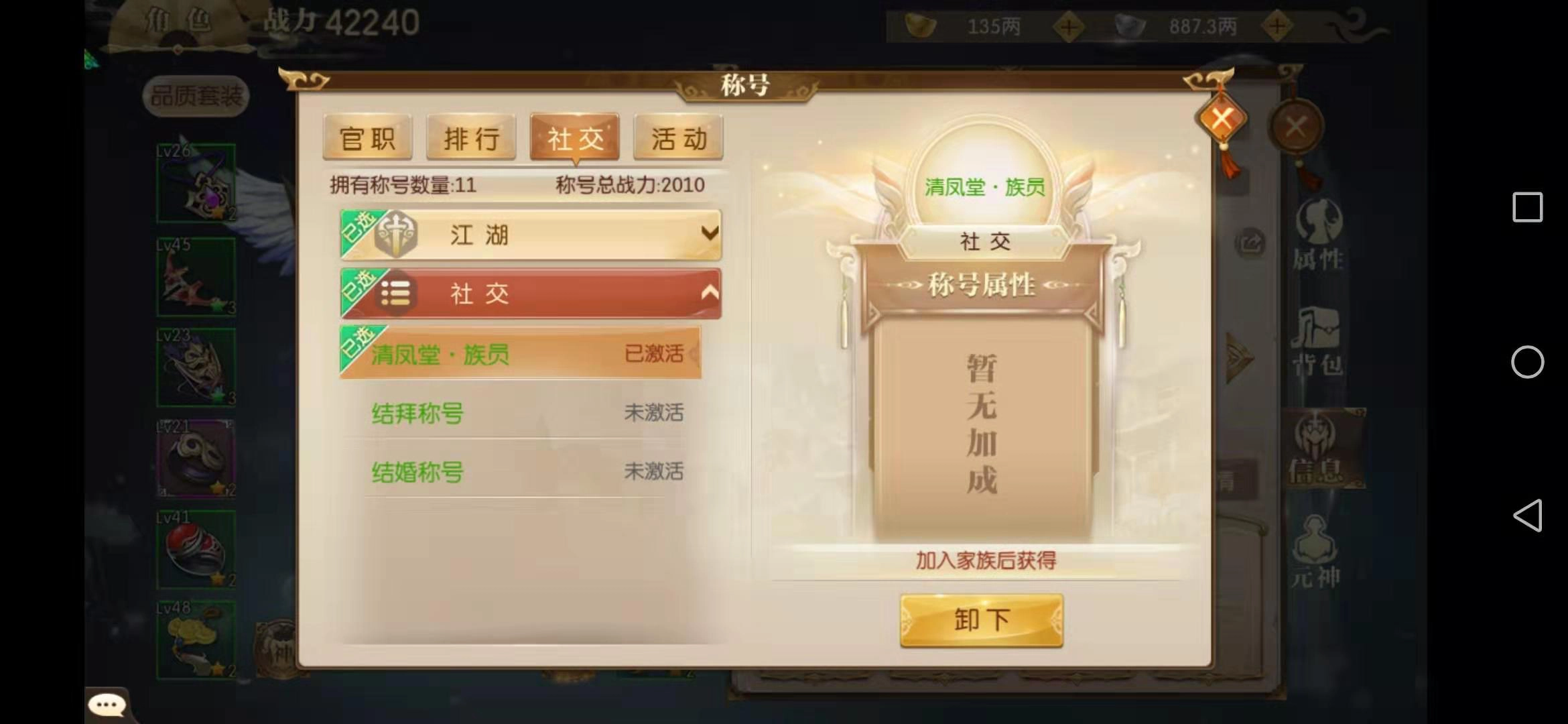 这一类称号获取门槛最低,主要分为江湖与社交两大类别。江湖称号只需顺着主线任务推进,就能自动解锁,过程十分轻松;社交称号则可通过加入家族、结拜或结婚等途径获得。由于获取方式较为简单,这类称号附带的属性加成也相对有限,因此无需特意去激活。
