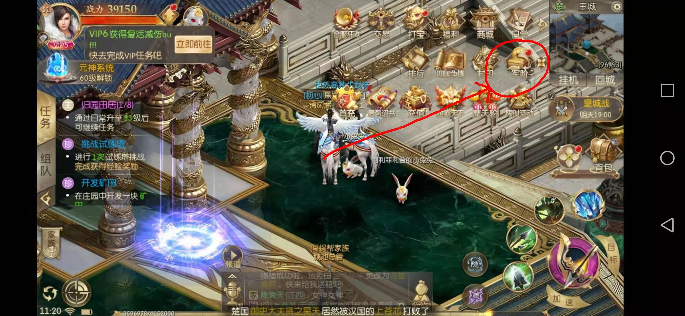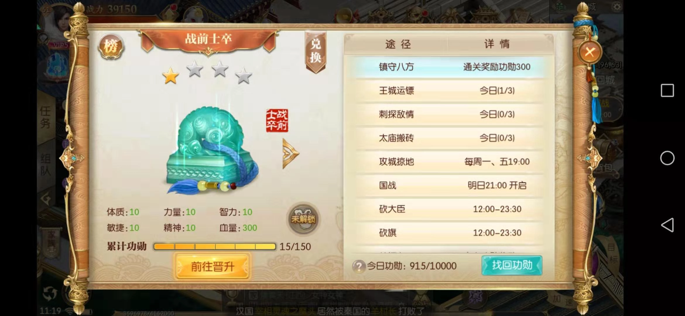 在界面里选择军阶选项,打开后就能看到自己当前的军阶等级和功勋值,点击下方的前往晋升,就能在皇帝那里晋升到下一阶军阶了。获取功勋的方式有很多,在军阶界面的右侧可以看到不少功勋任务,像镇守八方、王城运镖、刺探军情、太庙搬砖等都在其中。