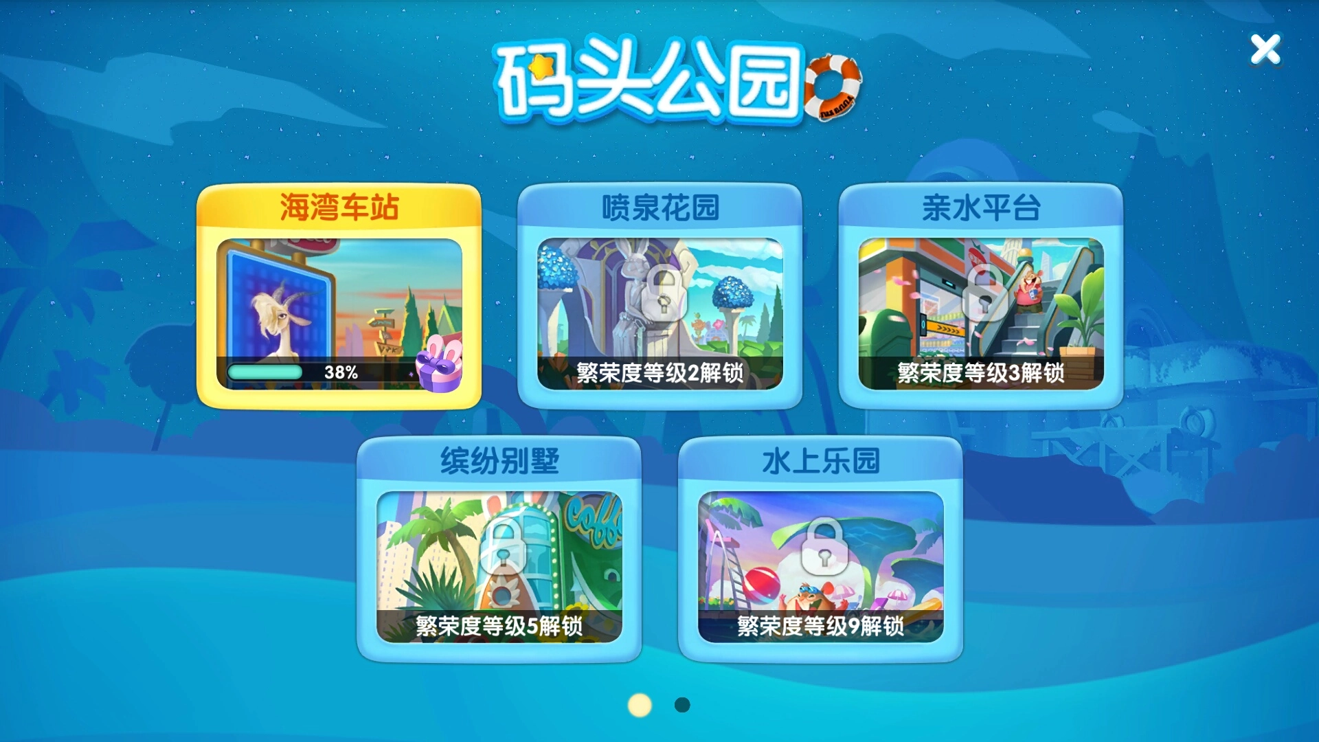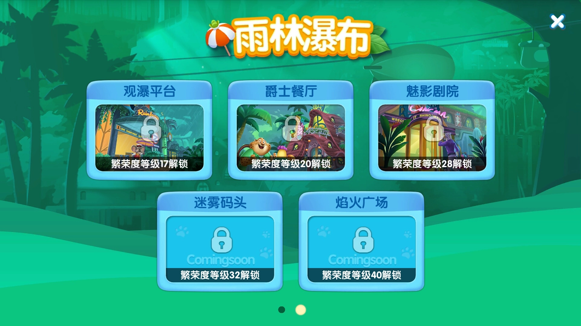 地图主要分为码头公园和雨林瀑布两类。码头公园包含海湾车站、喷泉花园、亲水平台、缤纷别墅与水上乐园;雨林瀑布则设有观瀑平台、爵士餐厅、魅影剧院、迷雾码头及焰火广场。