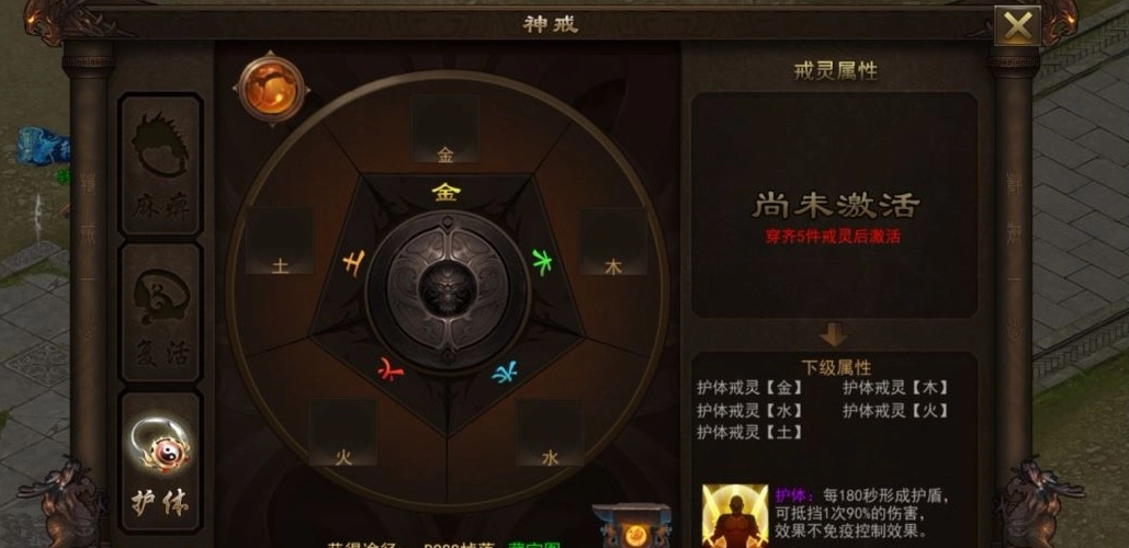 神戒是用于强化角色单一属性的装备,玩家总共可激活三类属性的神戒,分别为麻痹神戒、复活神戒和护体神戒。激活麻痹神戒后,每次攻击都有2.5%的概率使目标麻痹三秒,处于麻痹状态的目标无法进行移动和攻击操作;复活神戒的作用是让死亡的玩家即刻原地复活,并恢复20%的生命值与内力值;护体神戒则能每180秒生成一个护盾,该护盾可抵御1次相当于自身90%伤害量的攻击,不过此效果无法免疫控制类技能。
