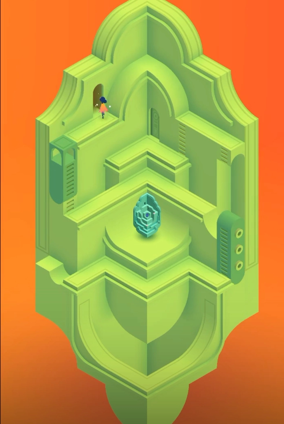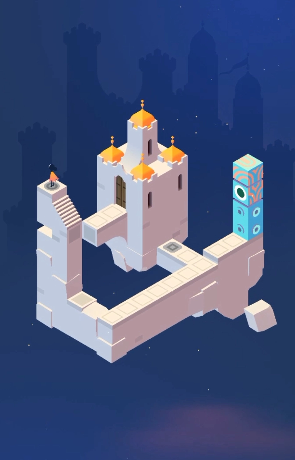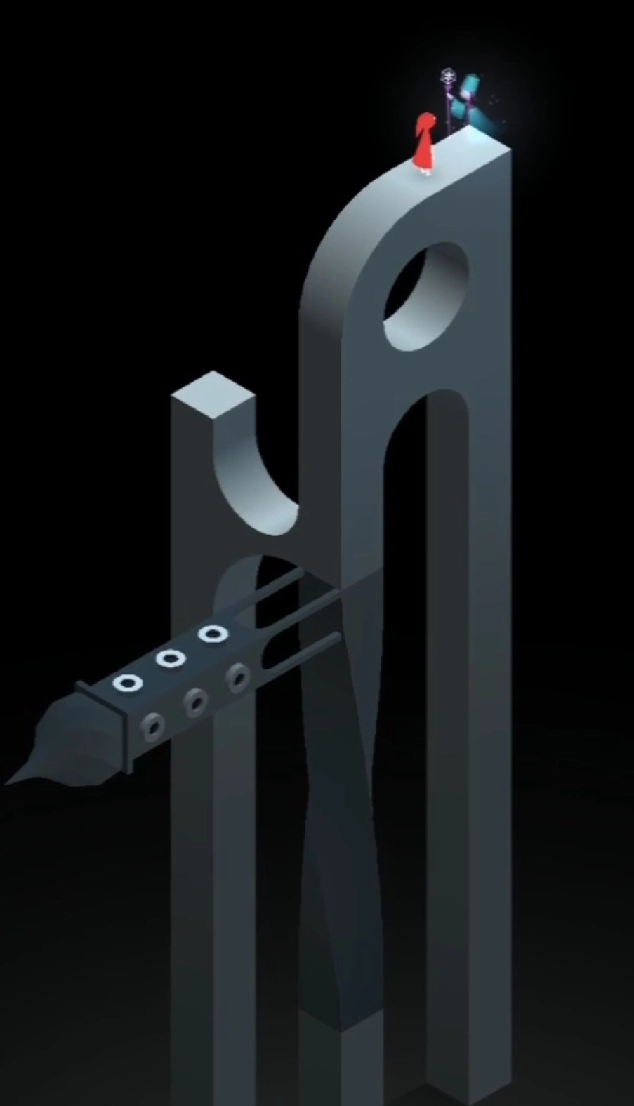 再次来到新的场景,多转几次建筑会来的顶楼出,此时剧情过后,场景又会变化,玩家要上楼按几个按钮并移动,让小人来到新的大门处。开启新的场景,往前走,转动建筑,发现新的大门,进入大门。从门里出来后,一直往上爬,去移动滑动板,通过滑动板来点亮两端灯塔,再前往终点就通过了。