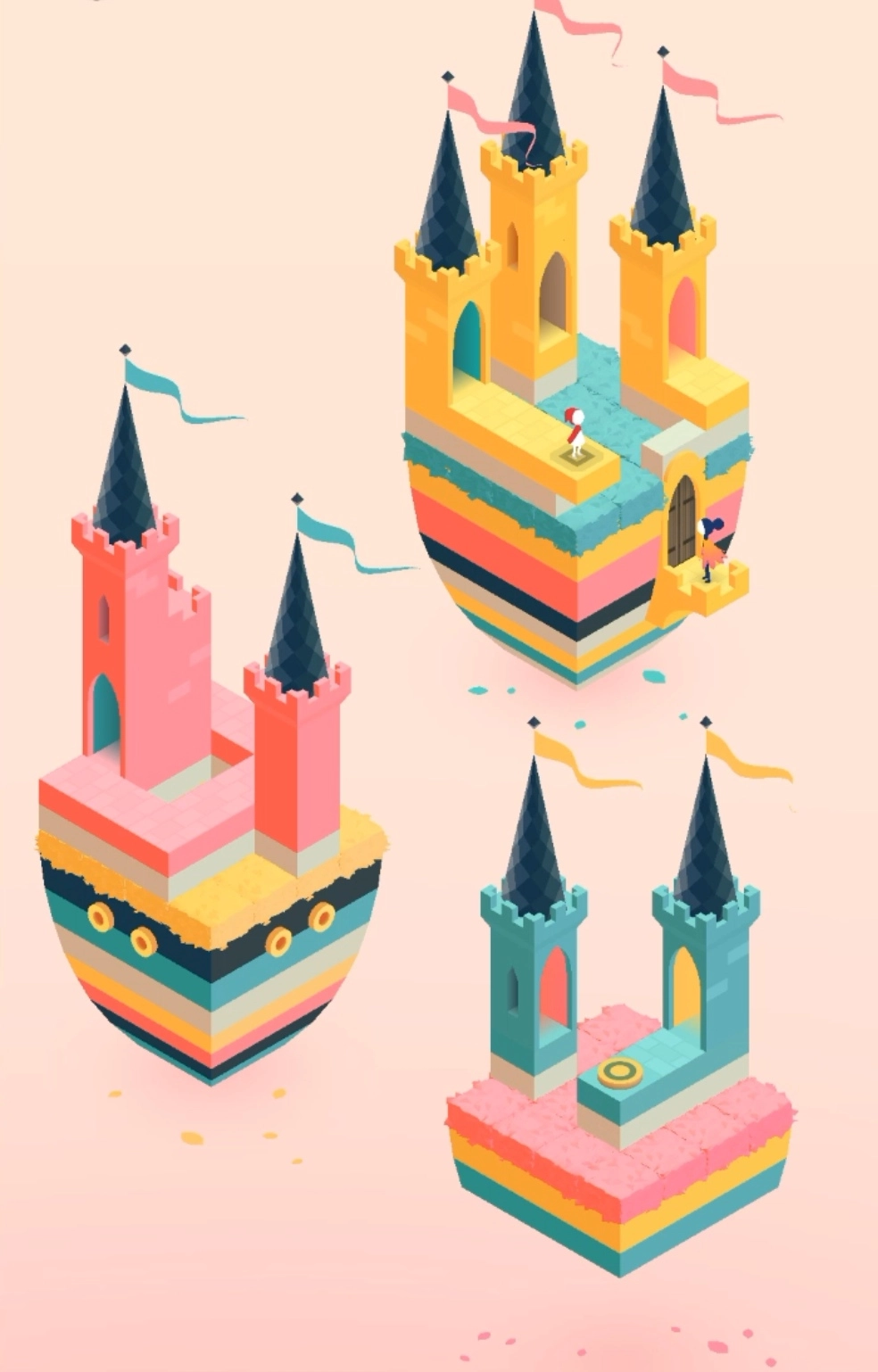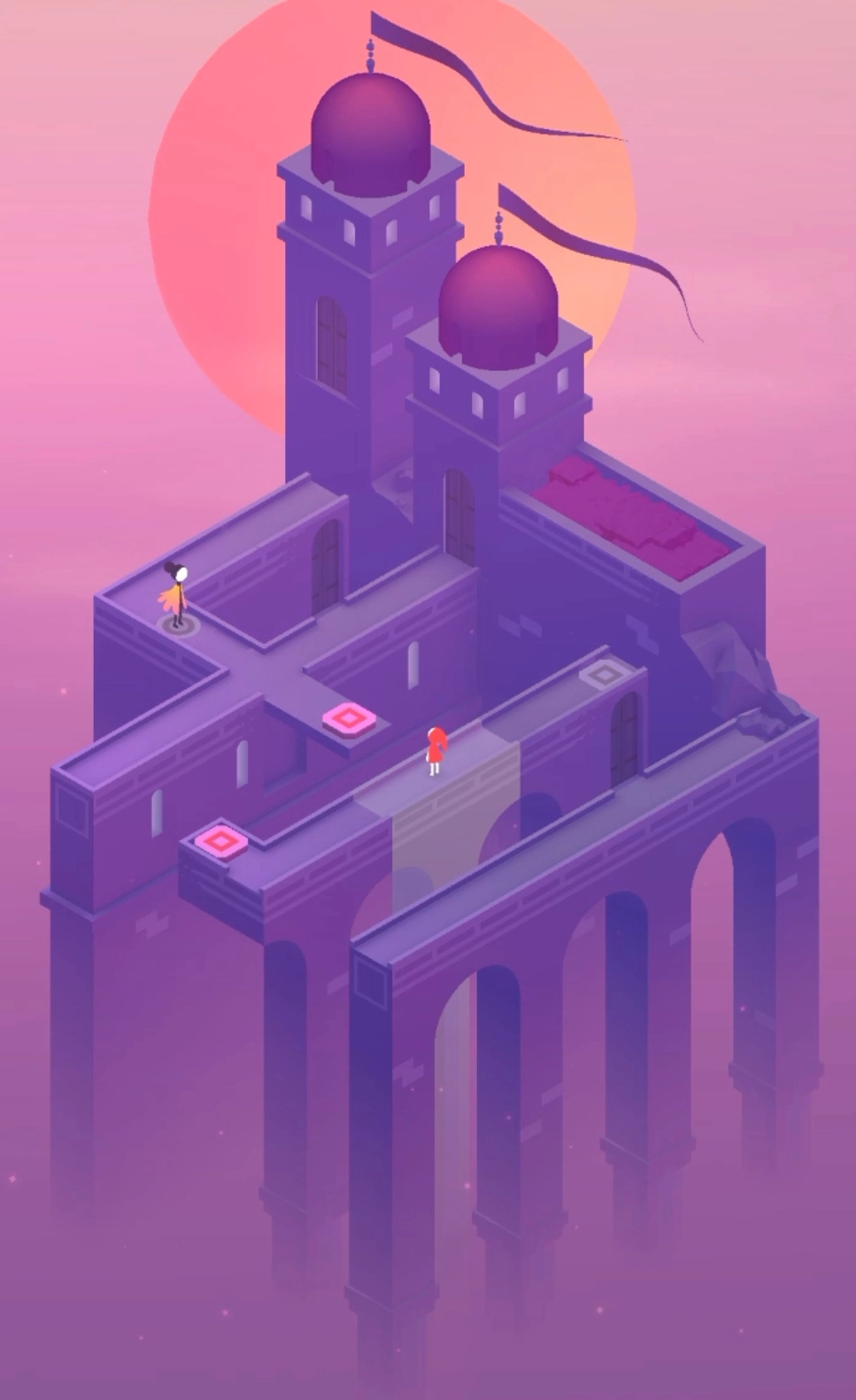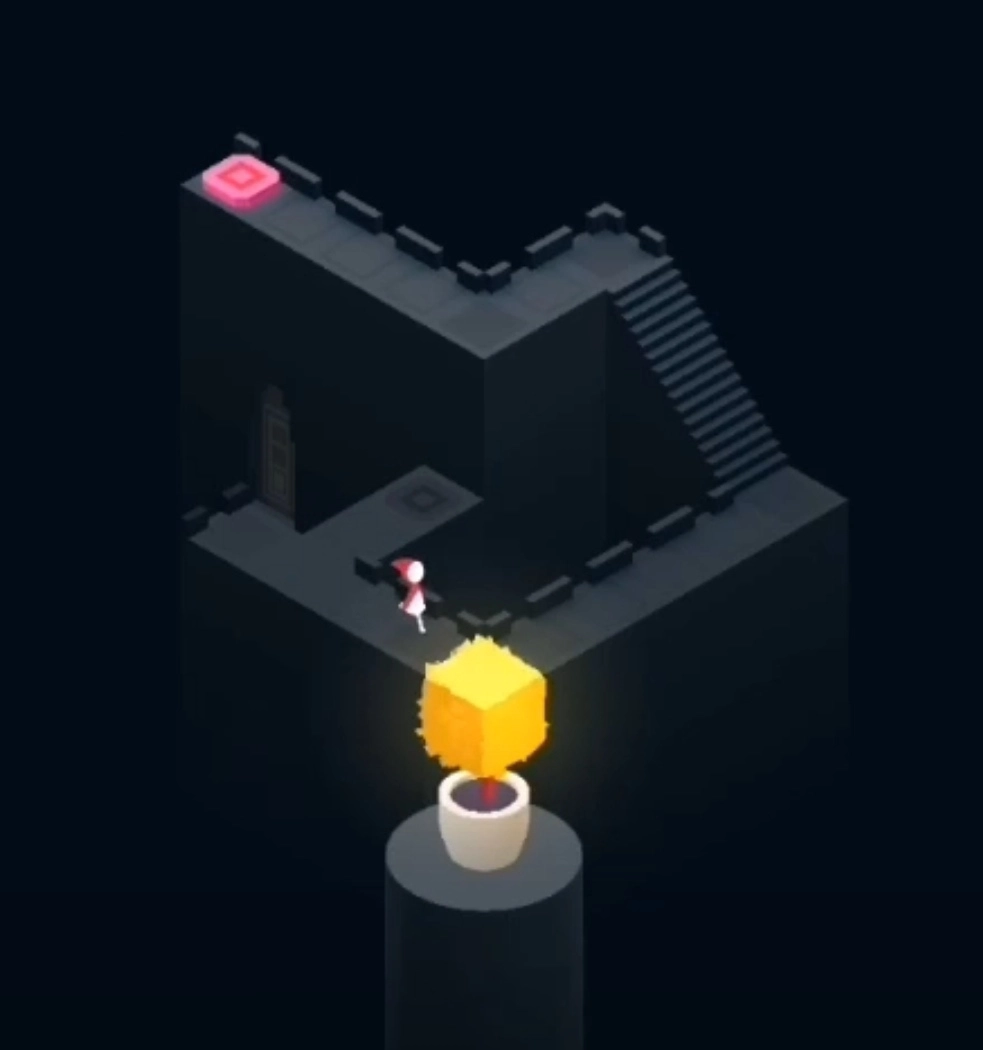 第五章:玩家首先要把建筑移到上方,让小人能走到粉色按钮上。接着重复这个操作,让两人进入门内。进入第二个空间后,罗尔母女会分开,只需让她们各自进入对应颜色的门即可。第三个场景很简单,找到隐藏的按钮就能通过。第四个场景先分离建筑,把下方的建筑旋转后合并,向前移动;再分离建筑并旋转,让女儿走到粉色按钮处,建筑会自动升高。之后让女儿到达顶层,此时建筑会发生变化,女儿就能直接进门了。