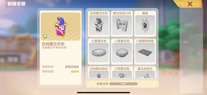 魔法小屋家具系列包含十七件可供获取的家具,具体有拉姆魔法衣柜、魔法双层小床、魔镜、七星魔法桌、七星魔法凳、七型魔阵地毯、拉姆魔法烛台、幻想魔法瓶、魔法地球仪、魔法书堆、超级魔咒辞典、多色魔法瓶、魔幻座灯、魔幻红水晶、魔法花蔓、七星魔阵椅和魔法幸运石。需要说明的是,这十七件魔法小屋家具均可在商店内进行购买。