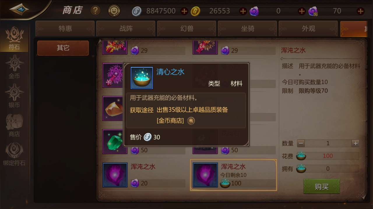 其次是进阶环节,进阶需要用到混沌之水这个道具,直接在商城购买即可,每个售价20符石。通常建议备上50个左右,换算下来就是1000符石,相当于100块钱。这样做是为了以防运气不佳,毕竟要从当前级别进阶5个等级才能达到最高级。