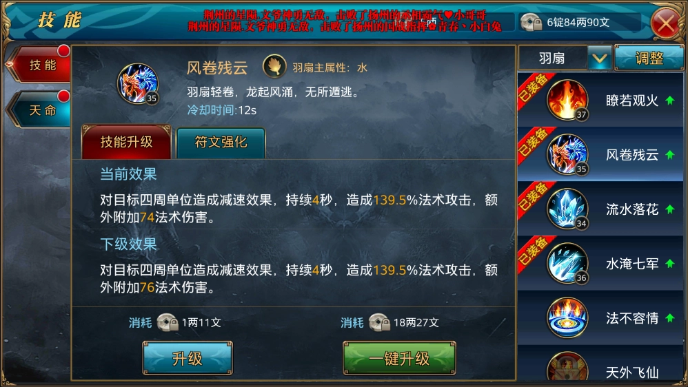2、“风卷残云”技能的冷却时间为12秒,属于输出控制类技能。其效果是对目标周围的敌人造成伤害,并且附带持续4秒的减速效果。