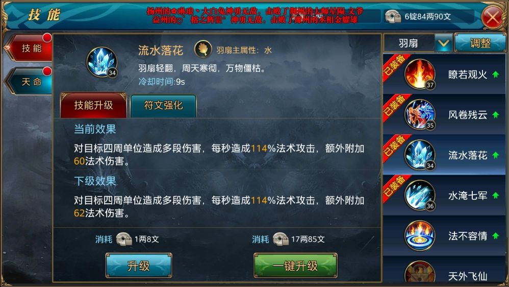 3、流水落花,冷却时长12秒,释放后能对目标及其周边所有敌人造成多段法术伤害,且每秒持续造成伤害,它是主要的AOE技能,也是我们较为常用的技能之一。