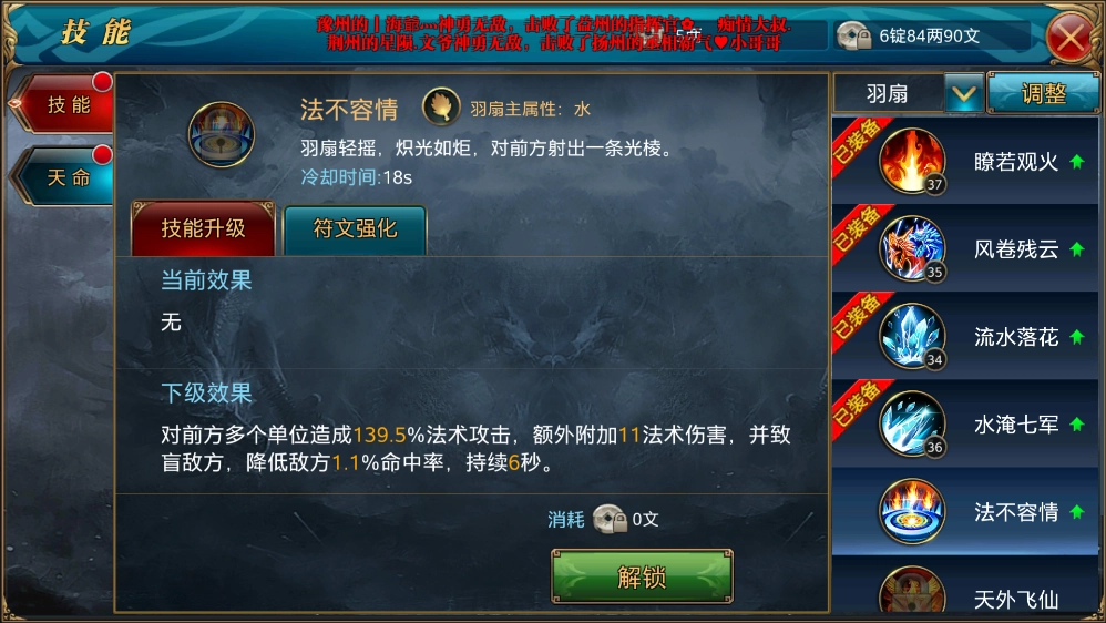 5、法不容情是一种直线伤害法术,能够对前方直线范围内的所有敌人造成直接伤害,同时有几率附加致盲效果,使目标命中率降低,该效果持续6秒。